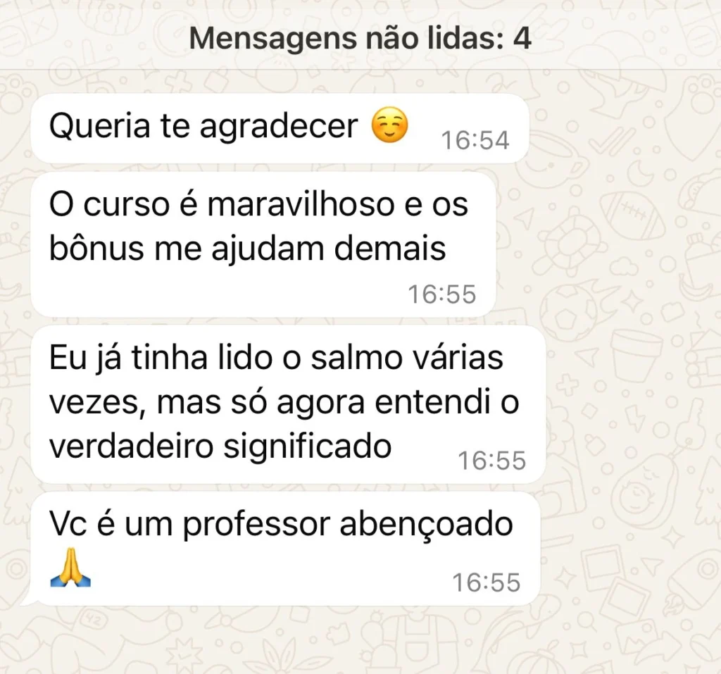 Este método é composto por uma série exclusiva de vídeo aulas, cuidadosamente estruturadas para aprofundar sua compreensão e aplicação do Salmo 91 na sua vida. São 8 aulas detalhadas, cada uma focada na análise e prática de 2 versículos do salmo, proporcionando um aprendizado passo a passo que torna os ensinamentos acessíveis e transformadores.